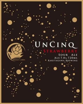 NOAH LABELの第一弾であるUN CINQは、尾崎くんの地元、韮山(静岡県)のイチゴを使ったサワーエール。ヘテロ発酵性乳酸菌を用い、低い温度でゆっくりと発酵させたのち、スパークリングワインボトルで瓶内2次発酵を施しました。ケグバージョンも同様に2次発酵を施しています。イチゴの味わいと香りが残り、口に含んだ時、イチゴを食べた時の余韻が残る様な上品な味わいに仕上っております。ラベルデザインはデザイナーと二足三脚で何度も打ち合わせを重ねた結果、泡が立ち昇る様を上から覗いてるデザインとなっており、真ん中から下が世界地図、上が星空をイメージ。今回は冬の星空ですが、一年間でリリース毎に星空が変化する仕上がりとなっております。