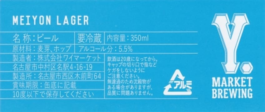 名古屋市中村区名駅4丁目の市場の活気に溢れる場所から生まれたラガービール。ワイマーケットが新たなものづくりの代名詞として挑戦的なラガースタイルを珍しい製法で楽しく仕上げました。比較的濃い味のメシに負けないしっかりとしたコクと心地よい香りのビールです。